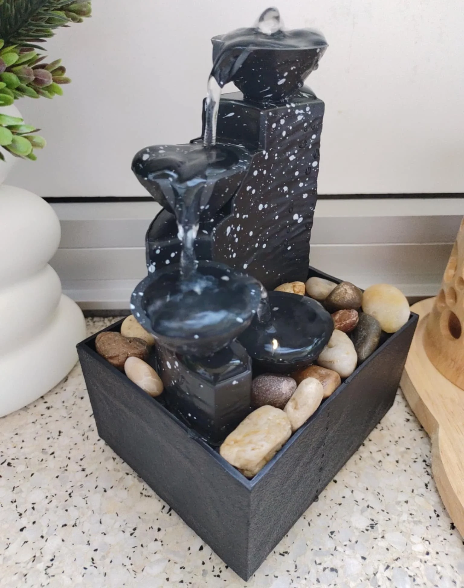 This tabletop waterfall desktop fountain serves as a serene home decor piece designed for relaxation and meditation. Featuring gently flowing water and subtle lighting, it creates a calming ambiance that enhances any space. The elegant ornamentation adds a touch of sophistication while promoting tranquility in your environment.